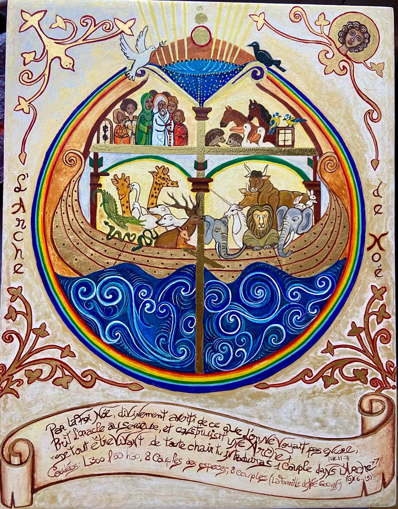 Cette Arche de Noé fut réalisée dans l’atelier de Nathalie Janvier, dans le jura, et elle est le fruit des enseignements de Saint Jean de Saint Denis, de feu François Chenue, et de Nathalie, qui nous accompagnent dans le plus grand respect des canons iconographiques, à réaliser des icônes au plus près de ce qui nous traverse…